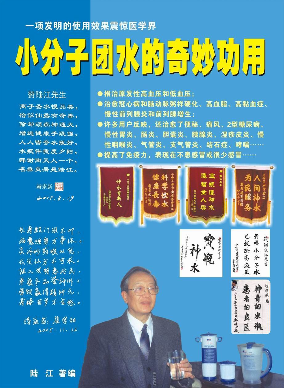----我國飲用微小分子團水,在世界上率先攻克了高血壓、冠心病和2型糖尿病,可以為國為民節(jié)省巨額醫(yī)藥資源,這是一項系統(tǒng)的惠民工程。可是當(dāng)前推廣難,阻力大。好在我國于2014年1月15日發(fā)表了中國科學(xué)家在國際上首次拍攝到小分子團水照片,表明有4個水分子締合的小簇團和單個水分子。[注3]但是教肓跟不上,我國詞典上至今不寫小分子團水,醫(yī)學(xué)教材中還沒有寫,醫(yī)生和我國許多人不懂小分子團水。某些人習(xí)慣于用常識否定發(fā)明,亂寫文章,誤導(dǎo)民眾,憑想像否定實踐出真知,忘記了實踐是檢驗真理的唯一標(biāo)準(zhǔn)。這是很重要的大是大非問題,人類不應(yīng)當(dāng)為缺水性的病終生吃藥和得不到健康,而是應(yīng)當(dāng)飲用微小分子團水治好病,并且避免因細胞缺水造成器官衰弱而致病,以延緩衰老,延長壽命。