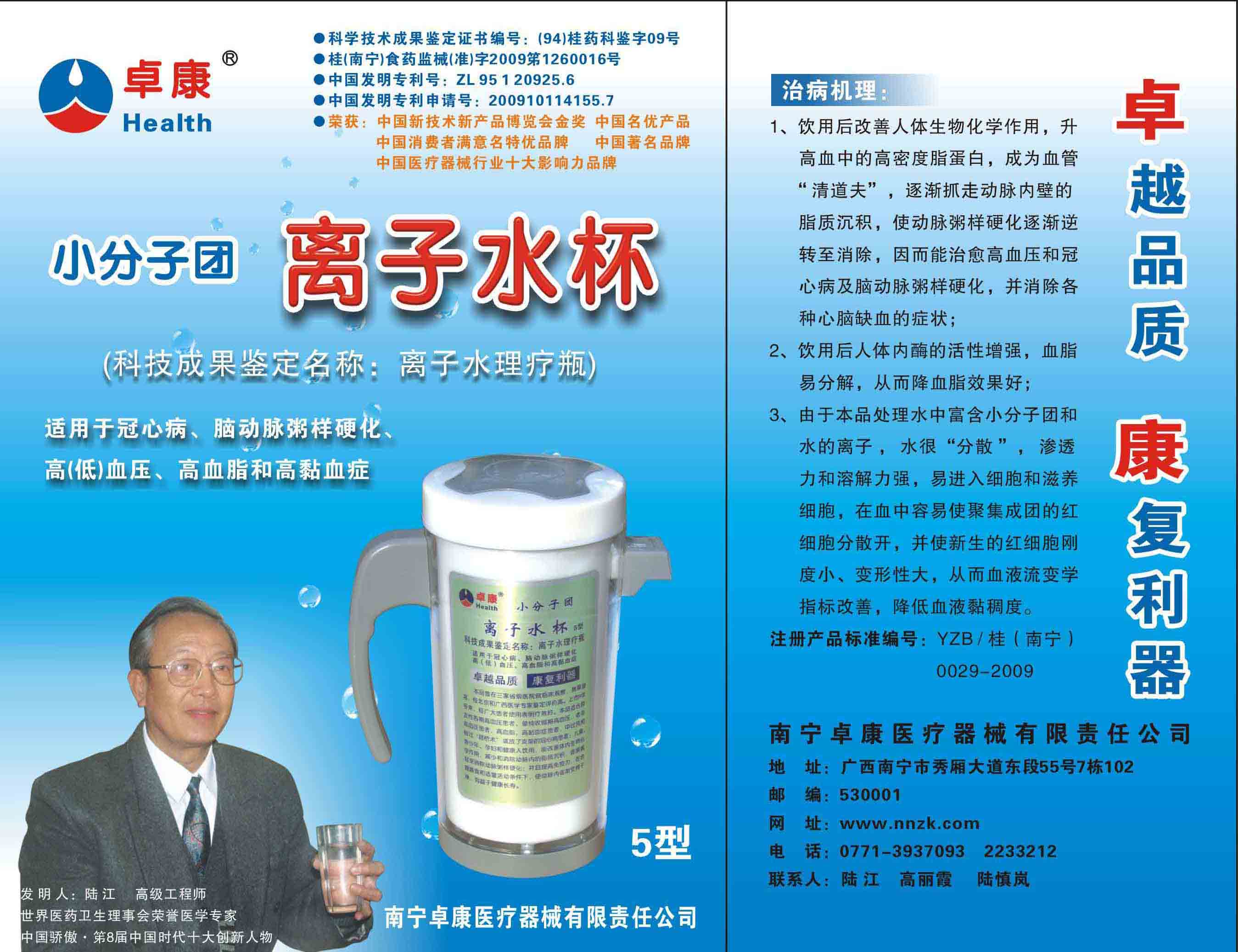 本品大量用戶的使用效果表明,能治愈冠心病、腦動脈硬化、原發(fā)性高(低)血壓、高血脂、高粘血癥、高血尿酸癥(痛風(fēng))和2型糖尿病、衰弱器官并發(fā)癥(前列腺增生、腎衰與尿毒癥)及中風(fēng)后遺癥等療效好。產(chǎn)品配信譽卡。使用壽命30年,不換芯,易清洗。團購優(yōu)惠。從郵局匯款,匯費1%,地址按本頁下方地址、聯(lián)系人寫。從銀行匯款,請點擊[聯(lián)系匯款]欄,從工商銀行匯款,建設(shè)銀行、農(nóng)業(yè)銀行匯款,均免收匯費,匯款后20--30分鐘內(nèi)發(fā)短信,可用微信轉(zhuǎn)帳,均免匯費,微信號即手機號13768308380。匯款后,告知你的姓名和地址,我公司聯(lián)系人手機號是:13768308380卓康牌離子水瓶為我公司獨家生產(chǎn),郵購產(chǎn)品配《補水的大智慧》彩印書一本,另配四季出版社出版的新書《補水的大智慧》一本,并配光盤一張(含央視主持人釆訪陸江的對話視頻)。目前市場和"淘寶網(wǎng)"上有人兜售假冒的偽品,望讀者審察辯別真?zhèn)危旒僬哓飧`假冒本公司的各種證、獲獎獎項、專利號和外包裝盒上的中英文字,包括科技成果的鑒定意見等,請讀者注意防偽。如何識別假貨?已經(jīng)買了假貨怎么辦?(請點擊[打假掠影][打假掠影])。